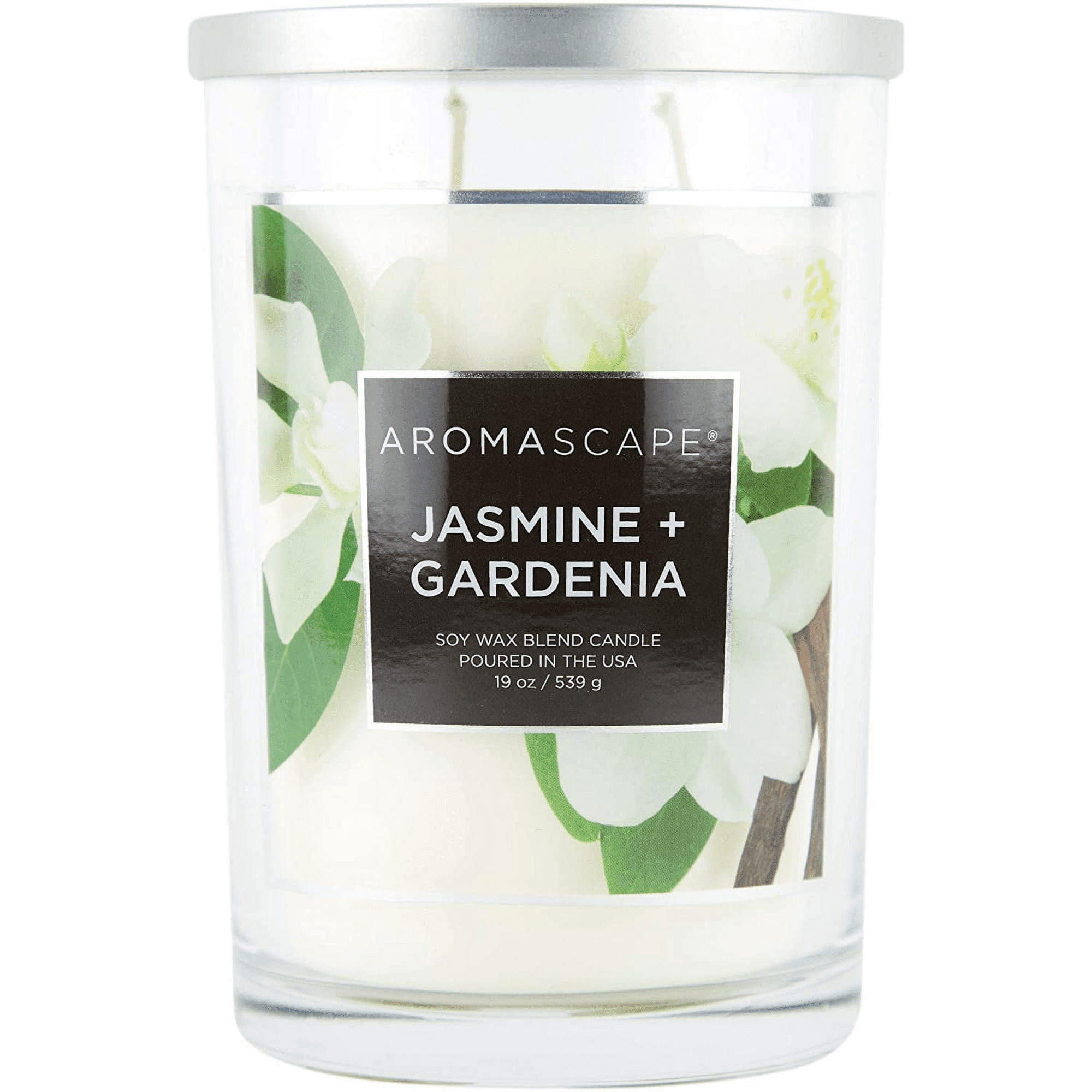 Soy wax blend candle with jasmine & gardenia fragrancelarge 19-ounce 2-wick candle, approximate burn time ranges from 60-80 hoursclear glass design with minimalist metal lid and scented color waxdesigned and poured in the usaperfect gift idea for any special occasion100% recyclable in partnership with terracyclean enchanting floral bouquet of rich jasmine and blooming white gardenia wrap around notes of golden amber and blonde woods. The aromascape collection features delicate and unique home fragrances. Drawing inspiration from tropical locales and lush botanicals. Trimming wick ensures an even burn. To reduce scooting, trim wick to 1/4-inch prior to lighting. Do not allow wick trimmings to accumulate in wax pool. As a general guideline, do not burn more than 2 hours at one use.Package dimensions 9.25 x 7 x 6.4 inchesitem weight 3.19 poundsmanufacturer aromascape