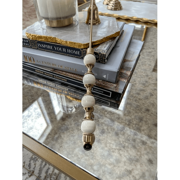 Dimensions: 12.5" l material: metal, ceramic description: this gold and white beaded candle snuffer ties back to our candlesticks! We love the intricate design and how it will look next to your favorite candle.