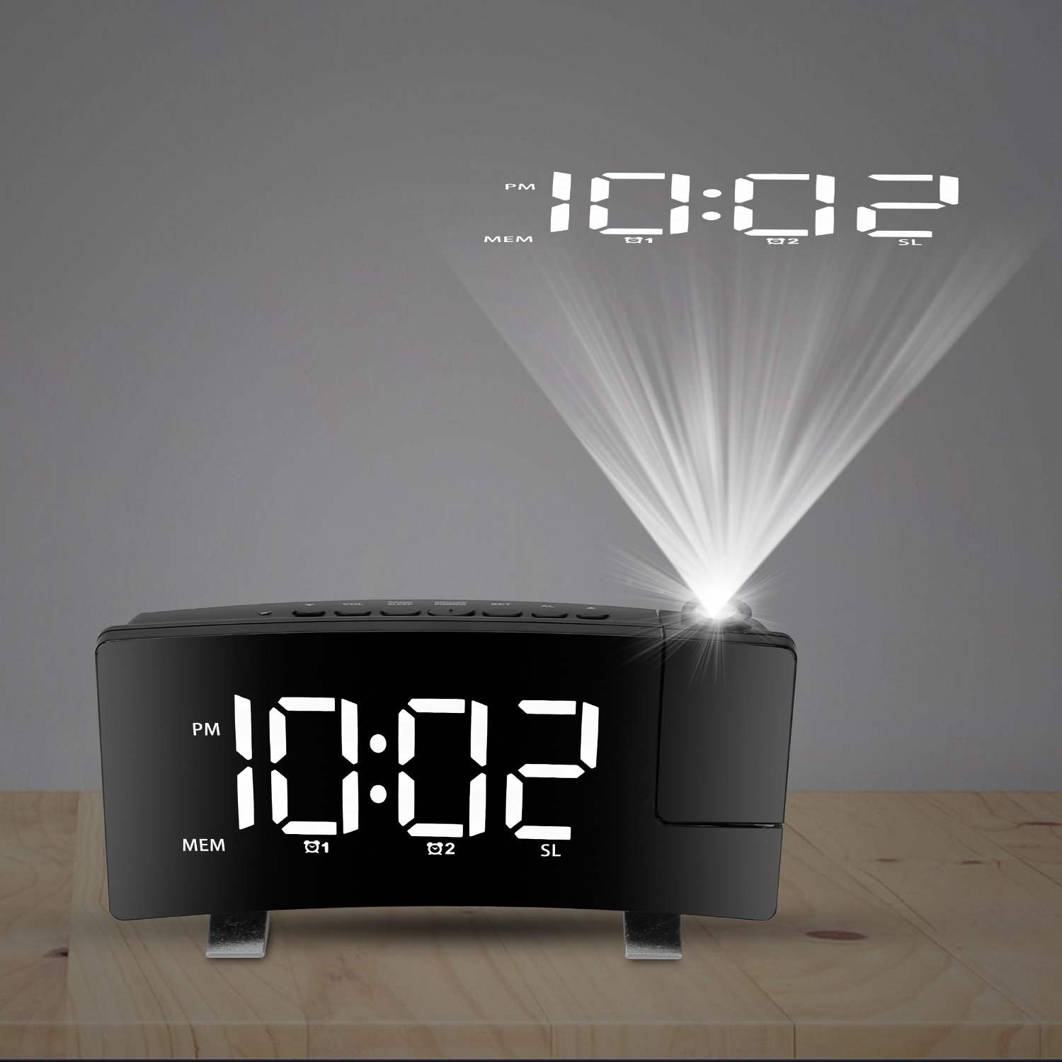 Home > Projection Alarm Clock with Radio Function 7.7In Curved-Screen LED Digital Alarm Clock w/ Dual Alarms 4 Dimmer 12/24 Hour USB Charging Port 180° Rotat