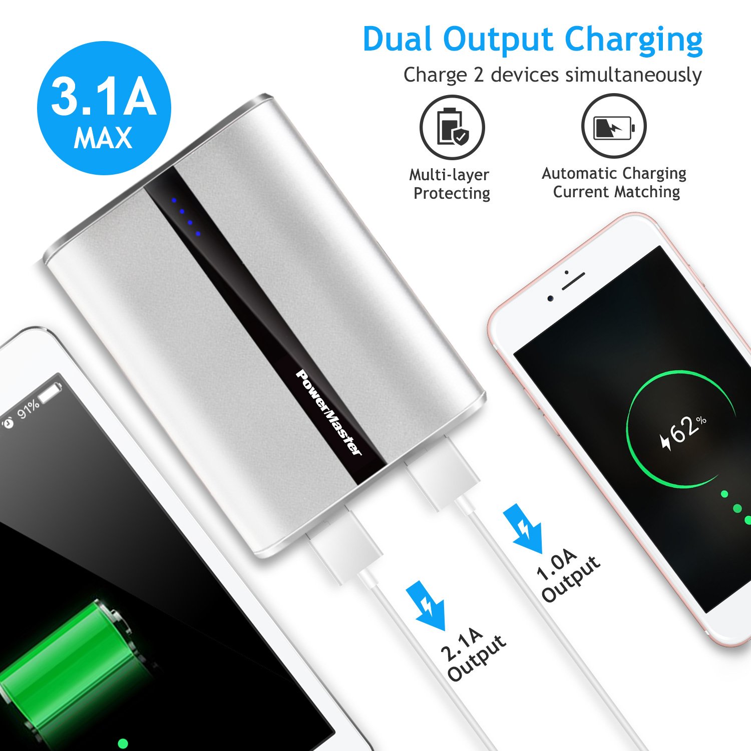 PowerMaster 12000mAh Portable Charger with Dual USB Ports 3.1A Output Power Bank Ultra-Compact External Battery Pack Fast Charging for IOS Phone Sa