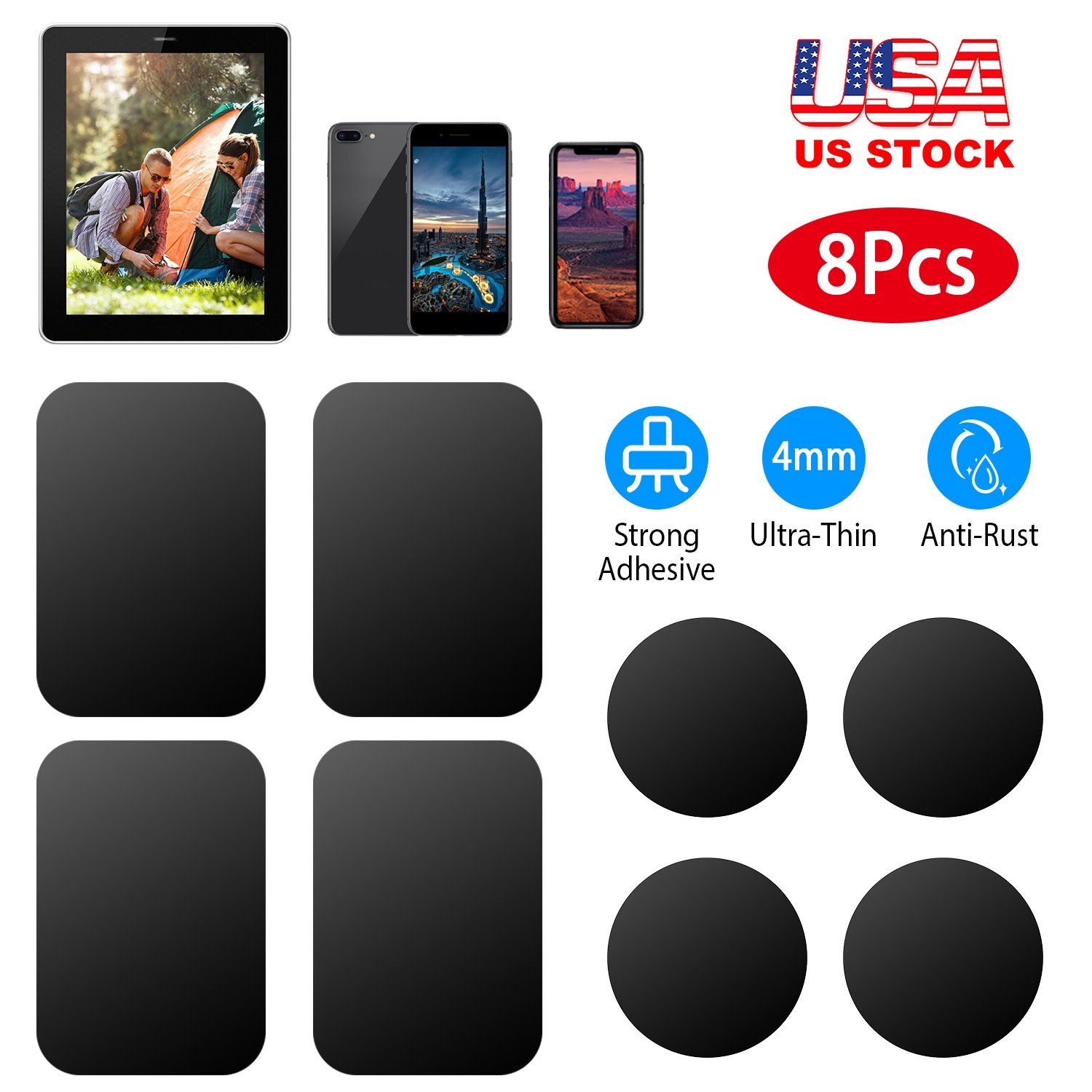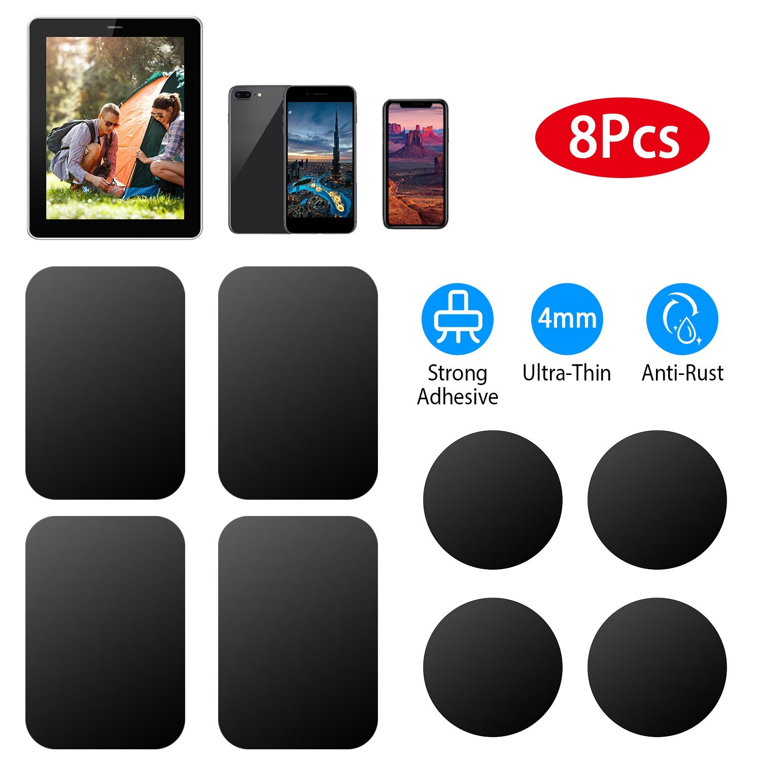 Home > 8Pcs Universal Metal Plates with Strong Adhesive 4Pcs Round and 4Pcs Rectangle Metal Plates for Magnetic Car Mount Phone Holder