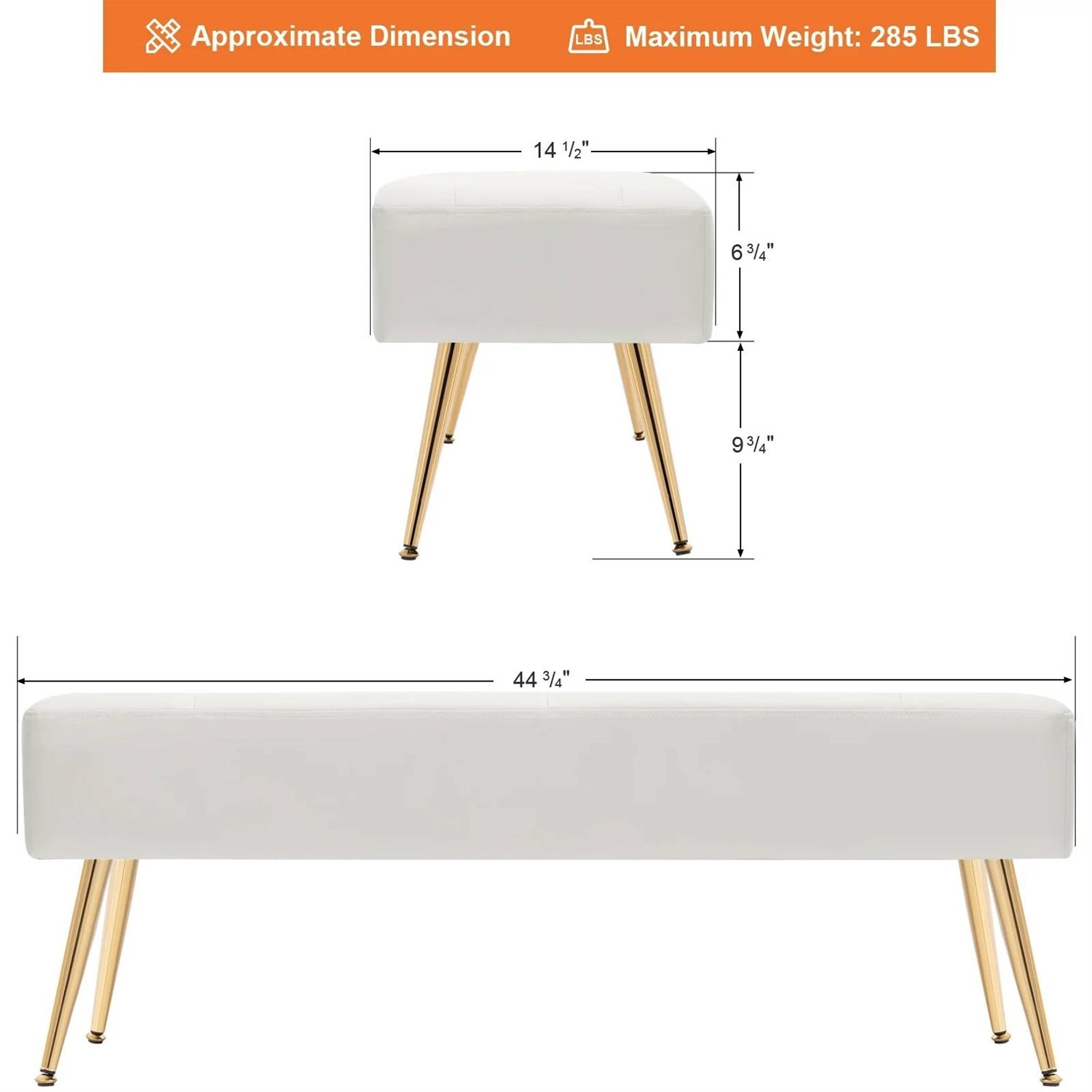 This Modern Bed Bench Ottoman with White Ivory PU Leather Seat and Gold Metal Legs is designed for maximum versatility, measuring 44.68" x 14.37" for the generous size that can be utilized in different rooms, like your hallway, bedroom, living room, office, studio, apartment, college dorm, etc. Four gold metal legs support the glam PU seat and bring seating luxury. Such a combination has not only a nice visual effect but also a comfortable sitting experience. Charming pleated design with elegant gold metal legs, beautiful and non-slip, convenient and durable. This beautiful bench will brighten up any room in your home and is a great gift for Family, Friends, and Colleagues. This Indoor Bench can be used as an entryway bench or as a bedroom Ottoman. This Modern Bed Bench Ottoman with White Ivory PU Leather Seat and Gold Metal Legs has used a scientific construction model, so the four metal legs and solid wood frame can stand a maximum weight of 285 lbs. This bedroom bench combines beauty and superior quality into one and can be used for a long time.